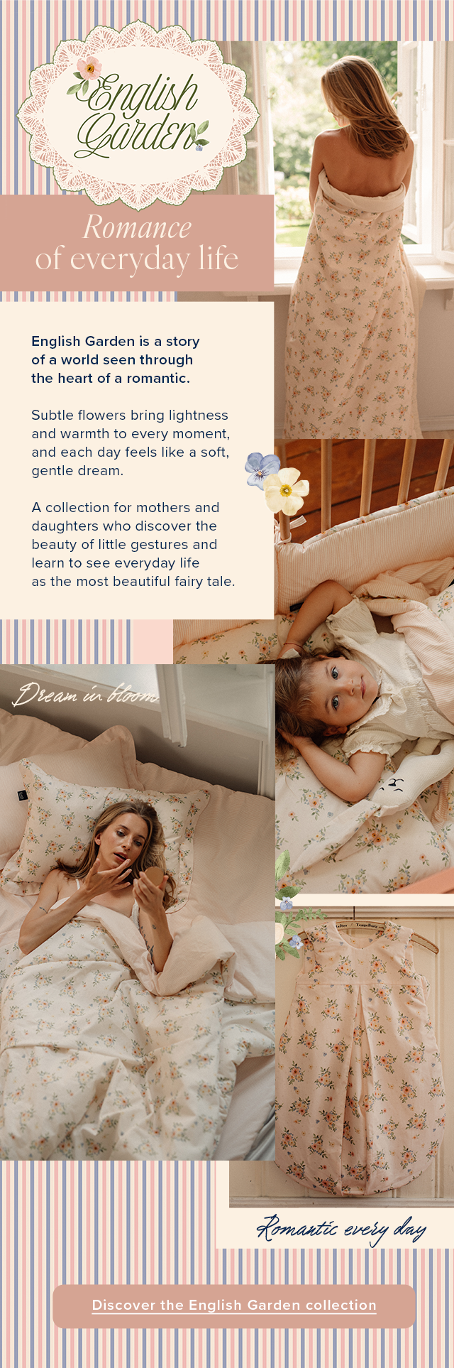 English Garden is full of subtlety and feminine charm. Floral baby bedding patterns bring lightness and elegance to the nursery, making every moment spent in such surroundings even more special. This collection was created with mothers in mind – those who appreciate aesthetics, harmony, and delicate touches in everyday life. It is a perfect background not only for a child’s sweet dreams but also for the relaxing moments of adults.