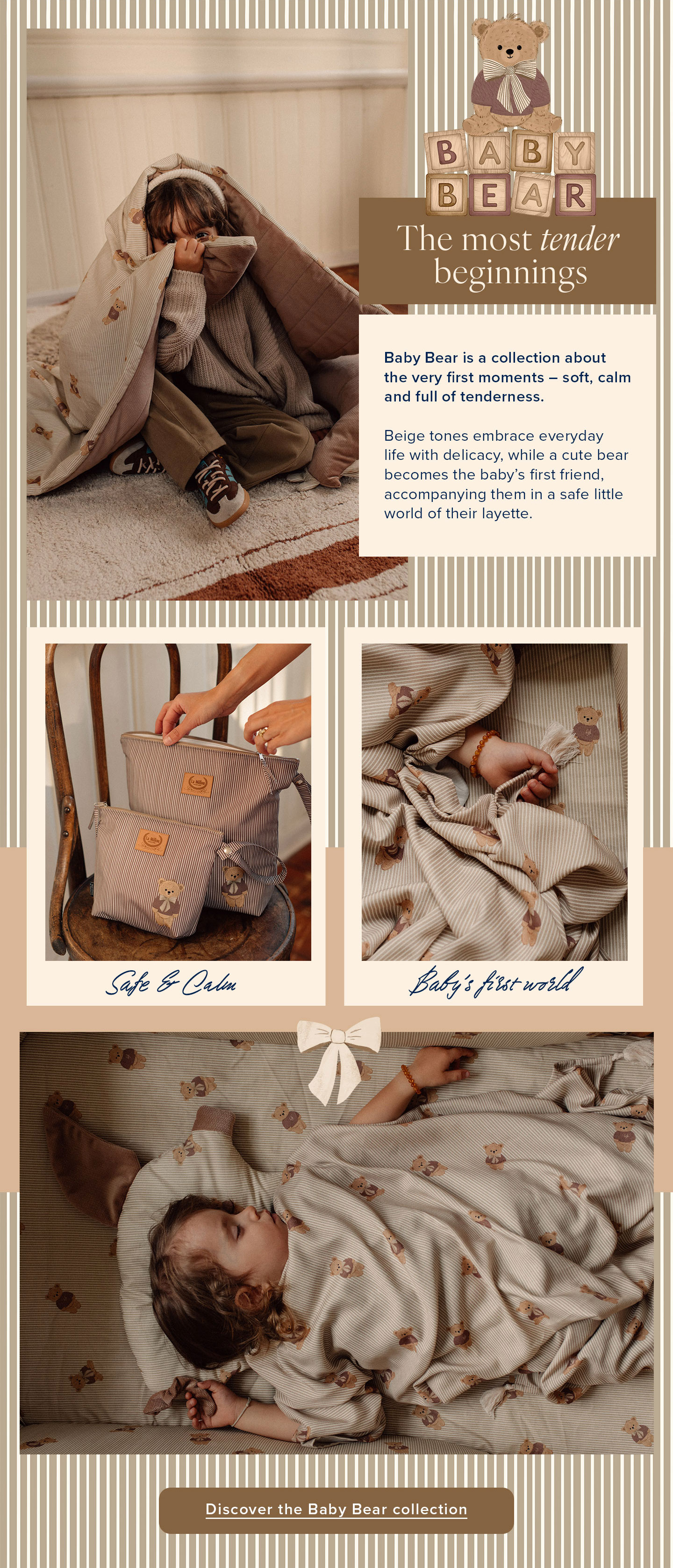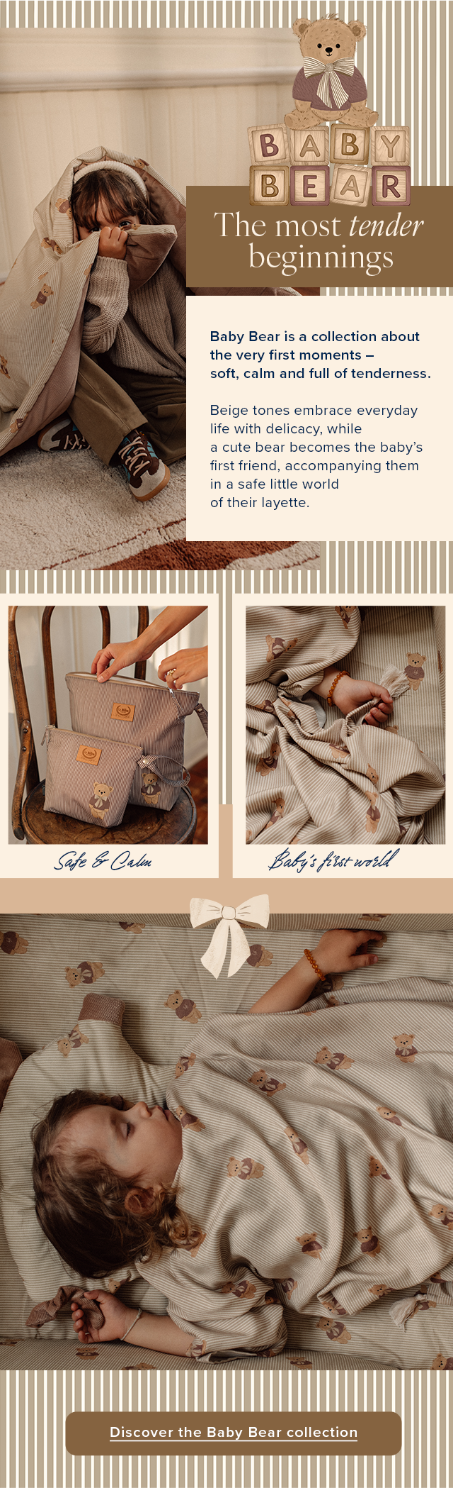 Delicate beiges, soft fabrics, and top-level safety – Baby Bear is a collection designed especially for newborns. Every detail of the nursery layette is refined with care, and the fabrics are certified to guarantee safety for the youngest ones. Ready-to-use bedding makes preparing the crib quick and easy, while the washable fabrics and hygienic design make Baby Bear an irreplaceable choice in everyday life of young parents.